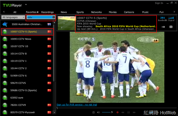 Step 1: 下載並安裝TVUPlayer之後,直接在[Search Channels]的框框裡鍵入[cctv],找到[CCTV-5 (Sports)],按下去就可以直接播放了。